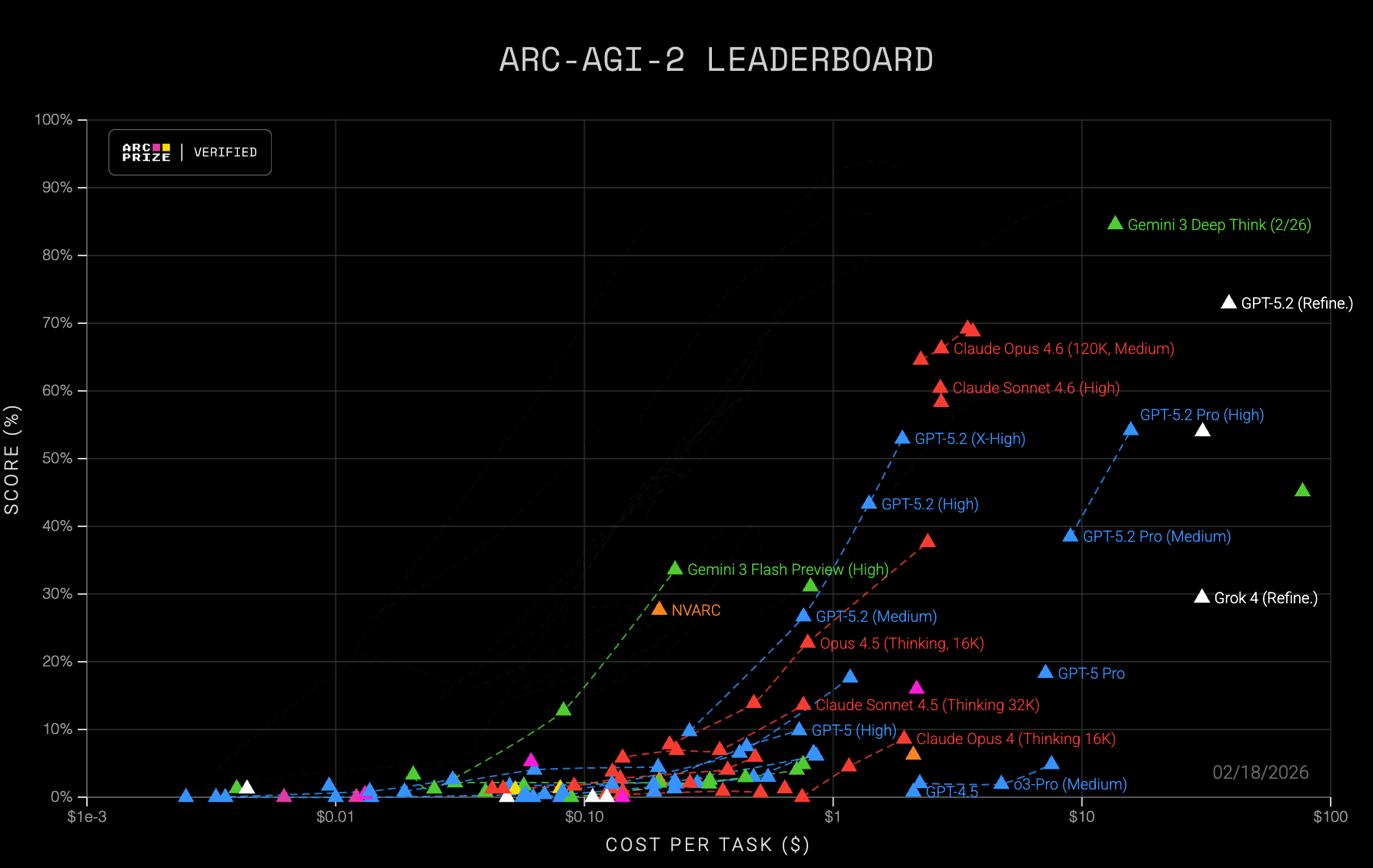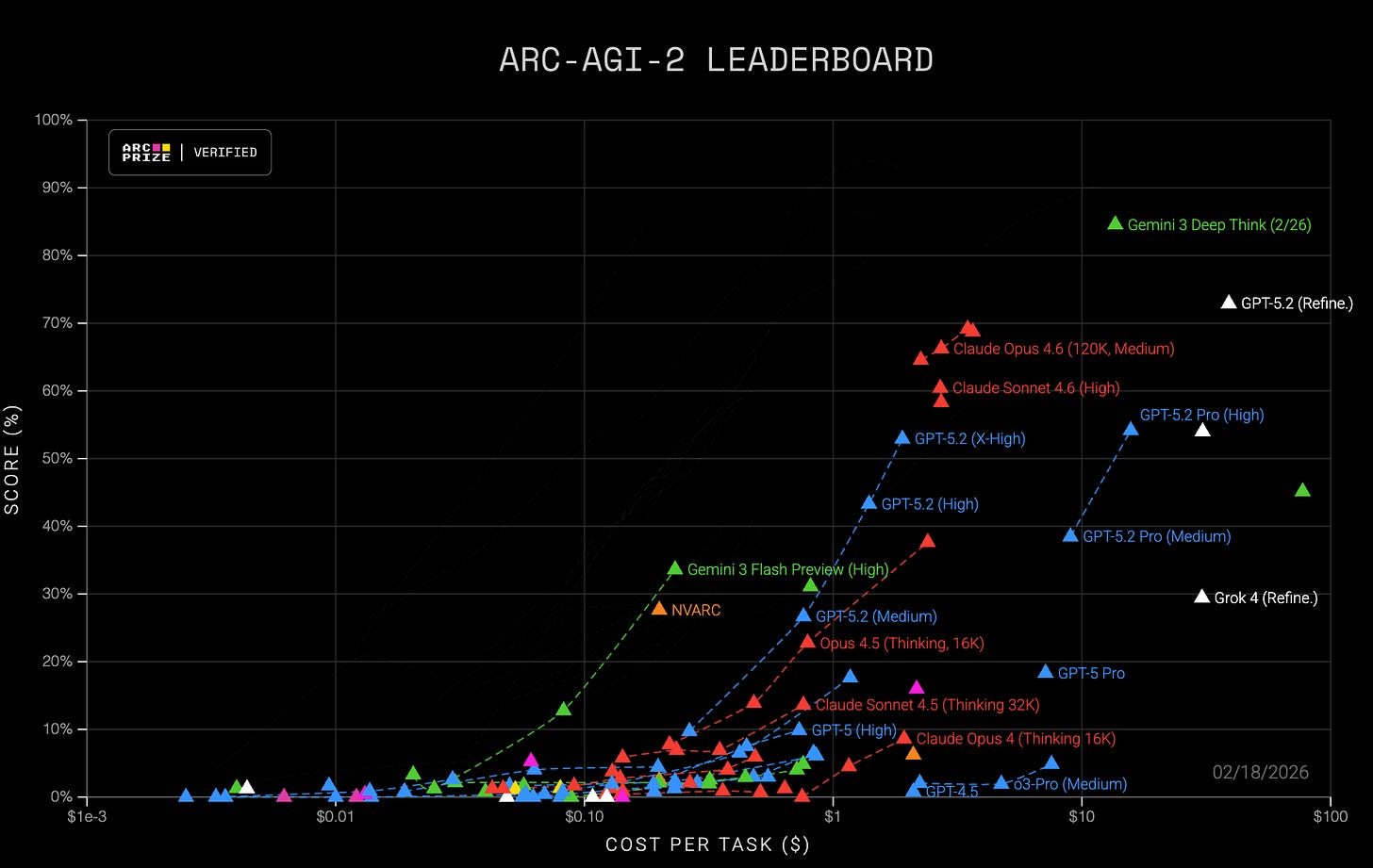 The ARC-AGI frontier has vacillated between different solution architectures - the early 2020s saw search-based program synthesis winning, while recent years saw chain-of-thought/reasoning LLMs pull ahead using transduction (producing the output grid directly instead of producing a program that produces the grid)… just look at how much of the frontier in the image above is dominated by Google’s green Gemini 3 Flash Preview and Gemini 3 Deep Think.