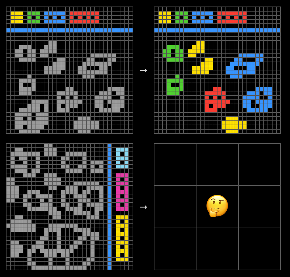 To help researchers measure skill-acquisition efficiency, the paper presented a set of puzzles titled “Abstraction and Reasoning Corpus (ARC).” Each ARC task includes pairs of pixel grids, each pair representing an input and an output. The test taker must determine the pattern between inputs and outputs and apply that pattern to a test puzzle (a lone input grid). For example, the following puzzle requires completion of a symmetrical pattern: